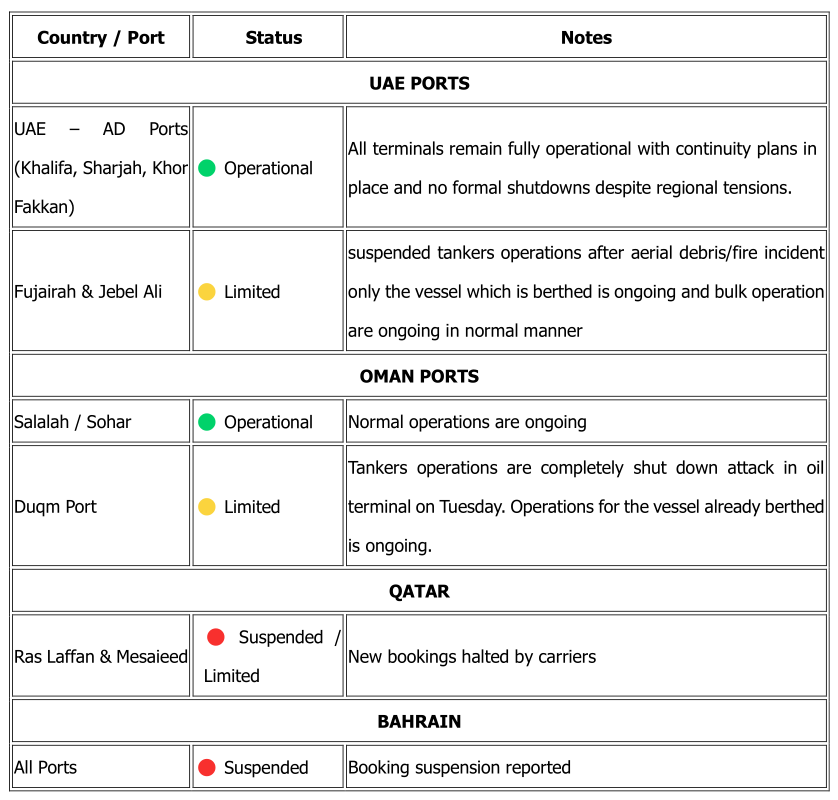 Note - Major liners have suspended new bookings to many Middle east ports.
