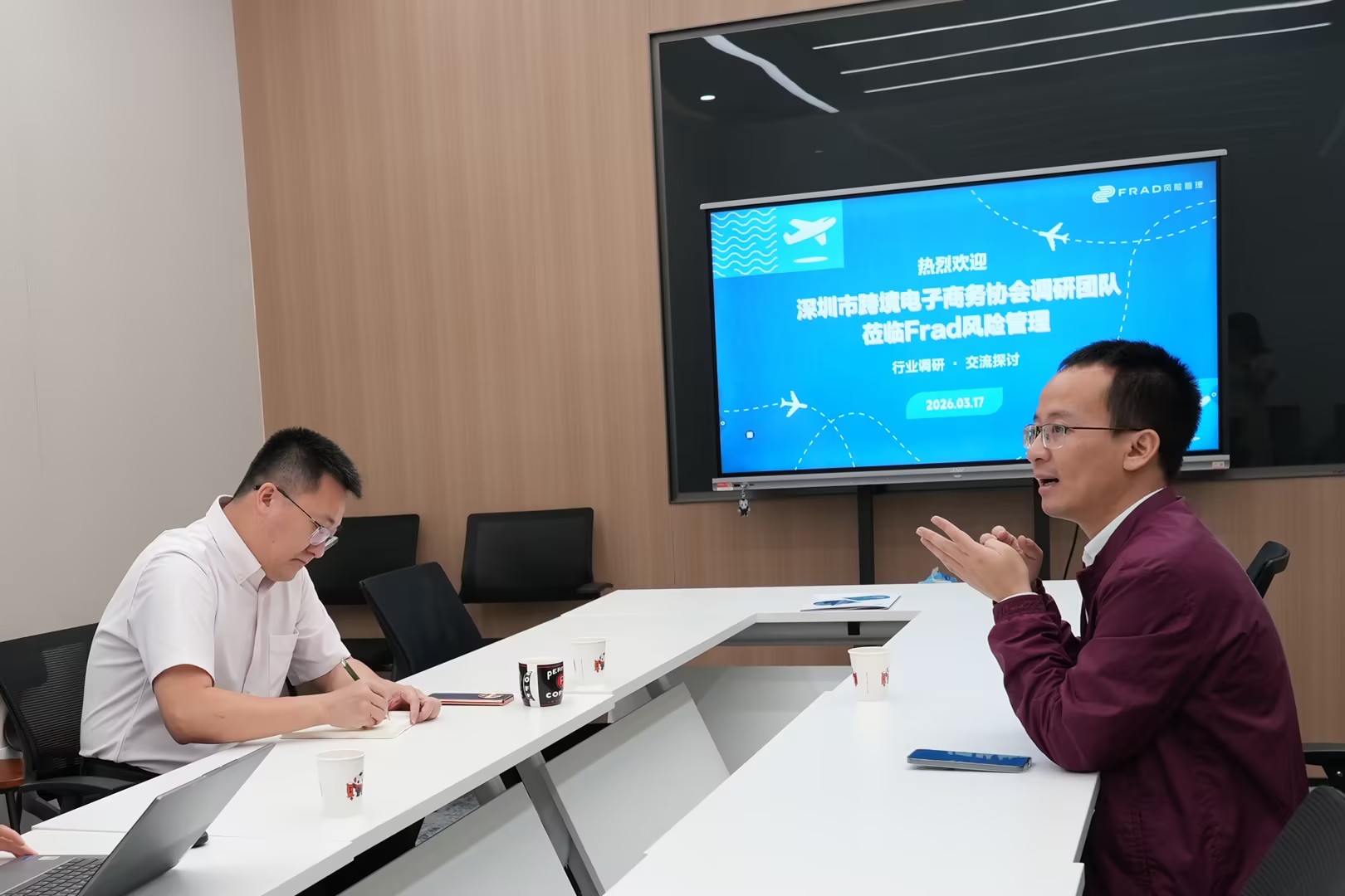 2026年3月17日,深圳市跨境电子商务协会(以下简称“深跨协”)党支部书记、研究院执行院长余刘畅到访Frad风险管理深圳深圳运营中心。据悉,此次调研旨在落实深圳市人民政府政策研究室关于“深圳市跨境电商高质量发展”的专题调研委托。Frad风险管理总经理辛思健出席座谈,双方围绕跨境风险管理、海外仓安全及产学研协同等议题进行了深入交流。