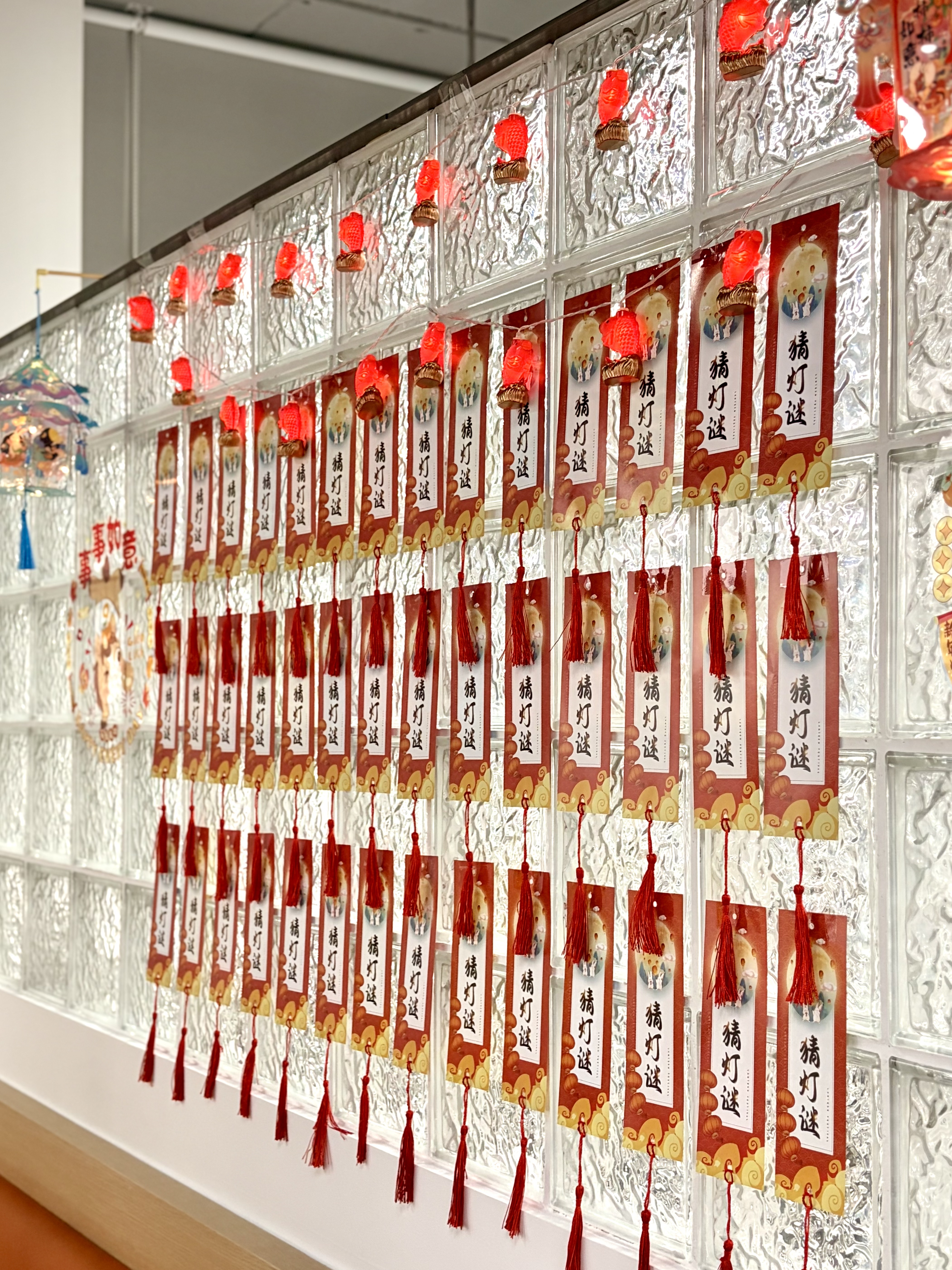 茶水间的一角,红色的灯谜卡片整齐悬挂,从谐趣字谜到生活小常识,难易交织。大家围拢在一起,有的眉头微蹙认真思考,有的灵光一闪拍手叫好:“我知道了!”