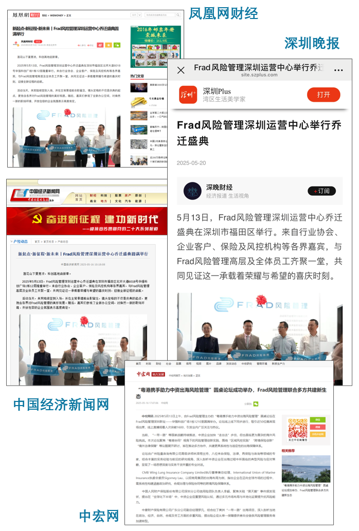 5月13日,Frad风险管理深圳运营中心新址正式启用,并同步举行“粤港携手助力中资出海风险管理”圆桌论坛、跨境出海风险管理及保险实务闭门研讨会等系列活动。来自保险、再保险、律所、行业协会及跨境企业等多领域的专家齐聚一堂,深入探讨风险管理关键议题,现场交流充分、成果丰硕。 随着乔迁仪式及系列活动圆满落幕,Frad风险管理在专业布局与生态协同层面的探索,正持续激发行业关注与共鸣。新华网、凤凰网财经、中国经济新闻网、深圳晚报、新浪新闻、深圳新闻网、中宏网、中国财富网等多家权威媒体纷纷报道,聚焦Frad风险管理在企业风险管理与理赔咨询服务领域的专业实践与创新路径,进一步彰显Frad风险管理的品牌实力与影响力。 我们特别整理了部分媒体报道截图,邀您一同回顾这一重要时刻。 同时,“粤港携手助力中资出海风险管理”圆桌论坛的精彩回顾视频也在持续发布中,欢迎关注「Frad风险管理视频号」获取更多现场高光内容。 未来,Frad风险管理将持续携手合作伙伴,深化联动机制,以专业为支撑、以服务为驱动,共同构建高水平的跨境风险管理生态体系,助力中国企业稳健出海、行远致远。