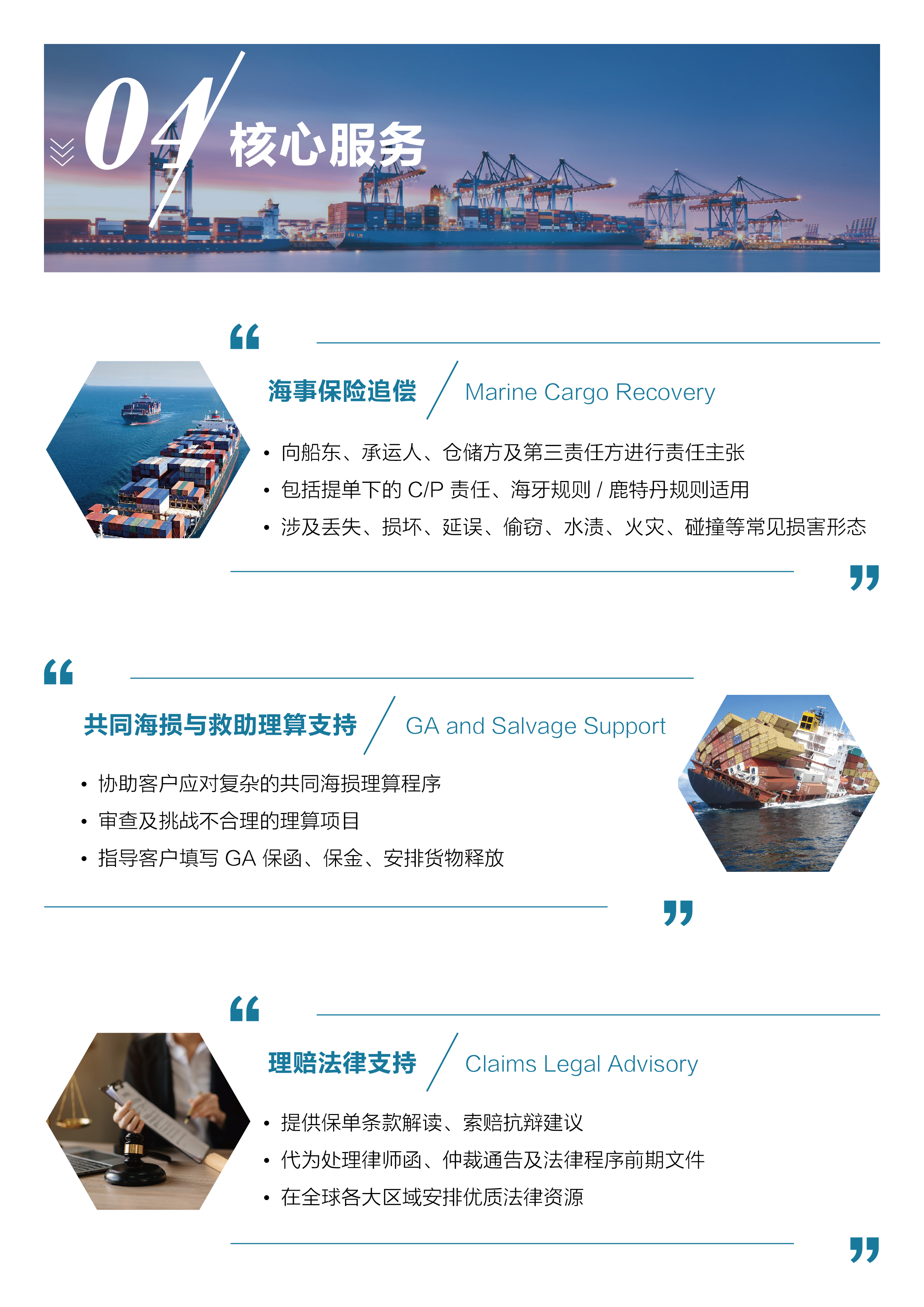 宣传册清晰梳理了Frad Legal的核心服务,包括海事保险追偿、共同海损及救助理算支持、理赔法律支持等,并结合丰富案例,涵盖不同航线、运输模式及跨境追偿场景,直观展现团队的执行力与专业性。