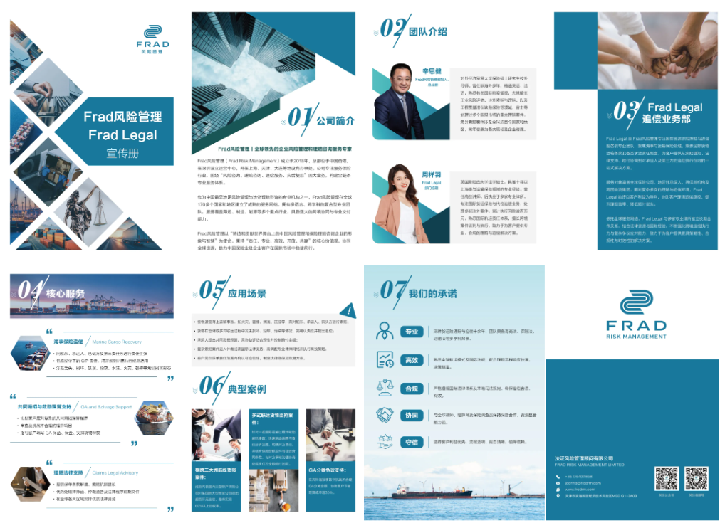 近日,Frad风险管理正式发布《Frad风险管理Frad Legal宣传册》,系统呈现团队在国际货运保险理赔与跨境追偿领域的专业能力与服务优势,为全球保险公司、再保险机构及跨国物流集团等客户提供更直观、更系统的业务了解渠道。