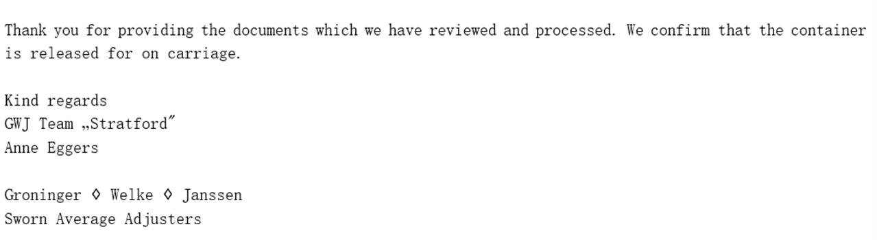 凭借在共同海损领域多年的专业积累,Frad风险管理高效、有序地处理了大量担保函件,确保客户货物顺利通关。通过标准化的流程管理,我们在本次复杂的共同海损事件中极大简化了客户操作,客户仅需在相应文件上签字盖章,其余事宜均由我们全程处理。