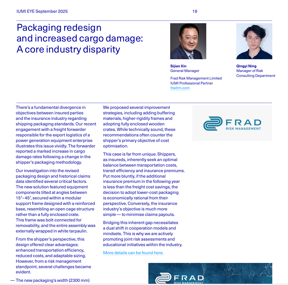 近日,国际海上保险联盟(IUMI)正式发布其官方刊物IUMI EYE Newsletter 2025年第三季度特刊,Frad风险管理的专题研究文章“Packaging redesign and increased cargo damage: A core industry disparity”刊登其中,再次代表中国专业机构发声全球海运保险舞台。